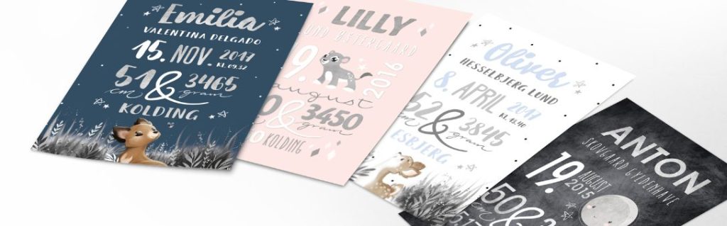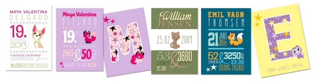 Und so sehen einige der Namensanzeigen heute aus. Ihr abgestimmtes nordisches Design und die minimalistischen Töne machen sie sehr beliebt im modernen Kinderzimmer, und alles wird mit den eigenen Geburtsdaten des Kindes gestaltet.**